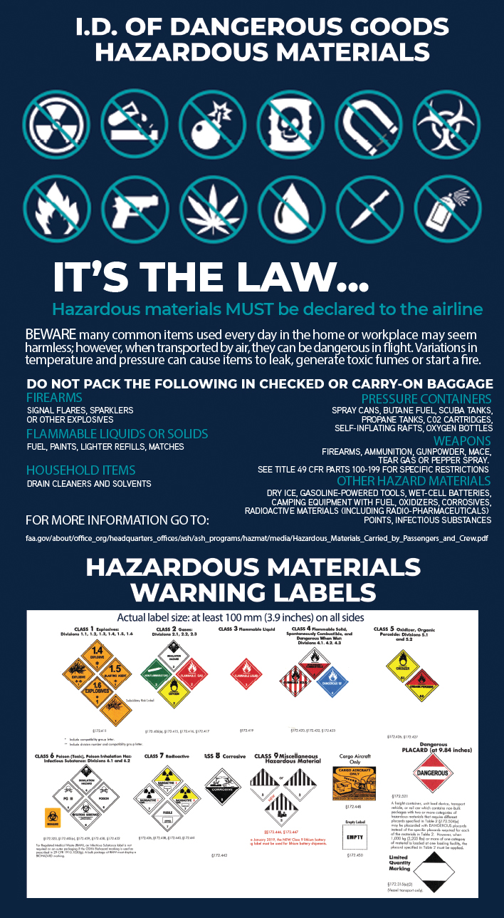 - Strike-anywhere matches, gasoline-powered tools, spray cans, self-inflating rafts, poisons, infectious substances, mace and pepper spray